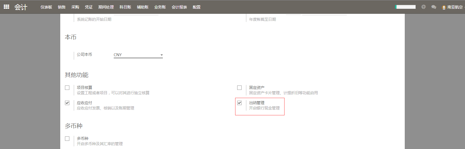 安装完会计模块后,可以进入:【会计】-【配置】-【设置】,找到“其他功能”区域,勾选“出纳管理”,然后点击“应用”
