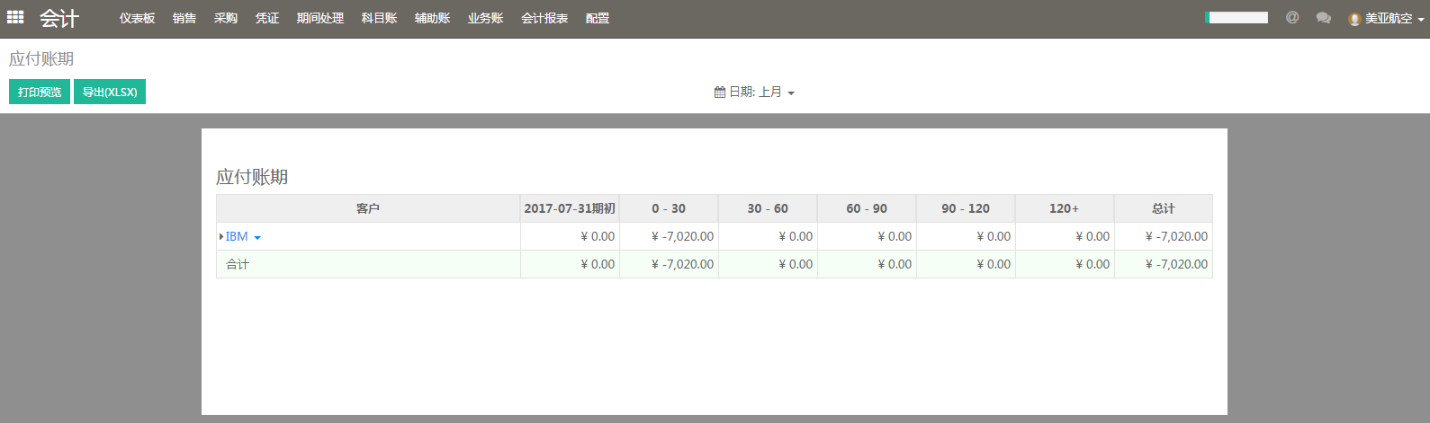 为了追踪给供应商的付款金额数,可以使用应付账期报表。可以在【会计】-【业务账】-【应付账期】找到。