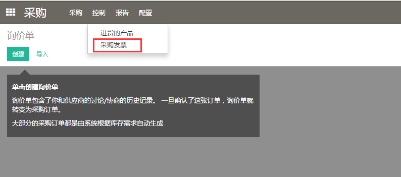 当收到供应商的发票后,可以在**控制**菜单下,创建发票。