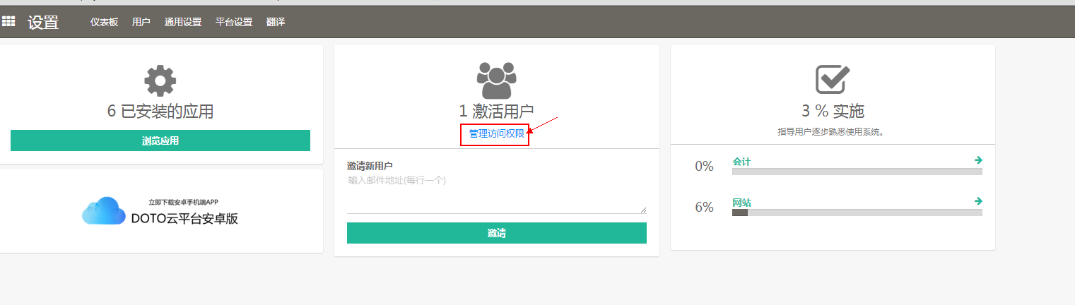 在平台界面中, 点击 设置. 进入到设置界面后,点击 管理访问权限.