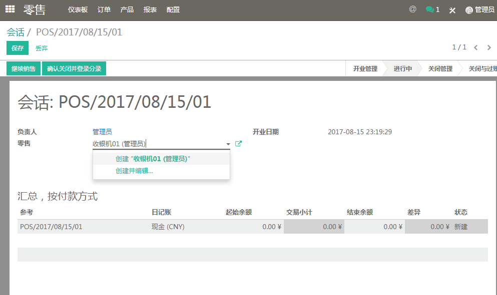 进入:【零售】-【配置】-【付款方式】,点击创建。
