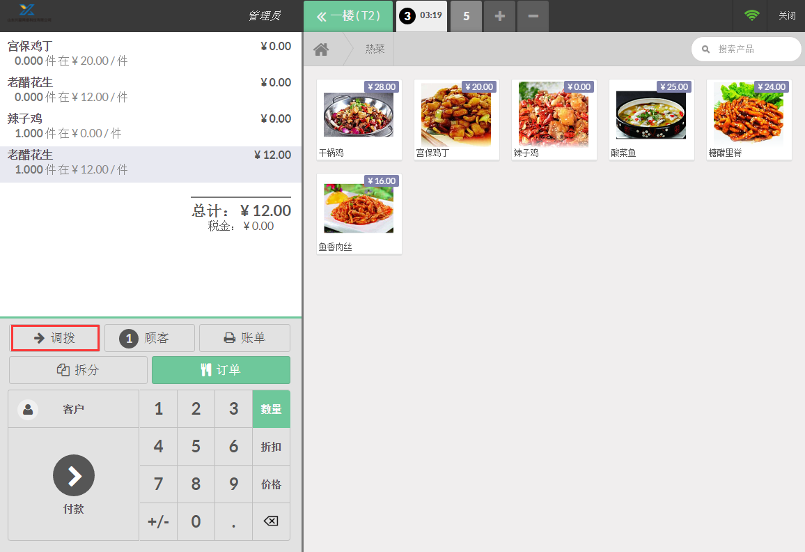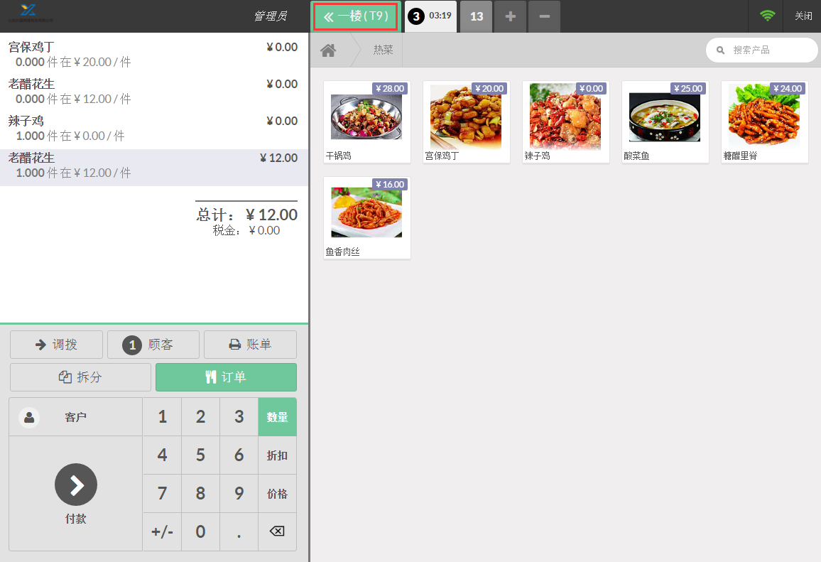 这功能只能在餐饮模式下使用。进入仪表盘,点击 新的会话 或 重新开始 。选择一个座位,例如:“T1”座位,然后生成零售单。由于某些原因,客户想换到“T9”桌。点击 调拨 。选择目标桌位。可以看到订单已经转到“T9”座位。See also如何管理现金?How to invoice from the POS interface?如何退货?如何设置周期性或者季节性打折?